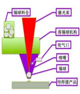 激光喷锡系统工作原理:锡球从锡球盒输送到喷嘴。激光加热融化后,直接覆盖在焊盘上,无需额外的焊剂或其他工具。焊接精度高,对于温度有要求或软板连接焊接区域。在整个过程中,焊点与焊接主体没有接触,这是一种非接触焊接方式,解决了焊接过程中接触带来的静电威胁。